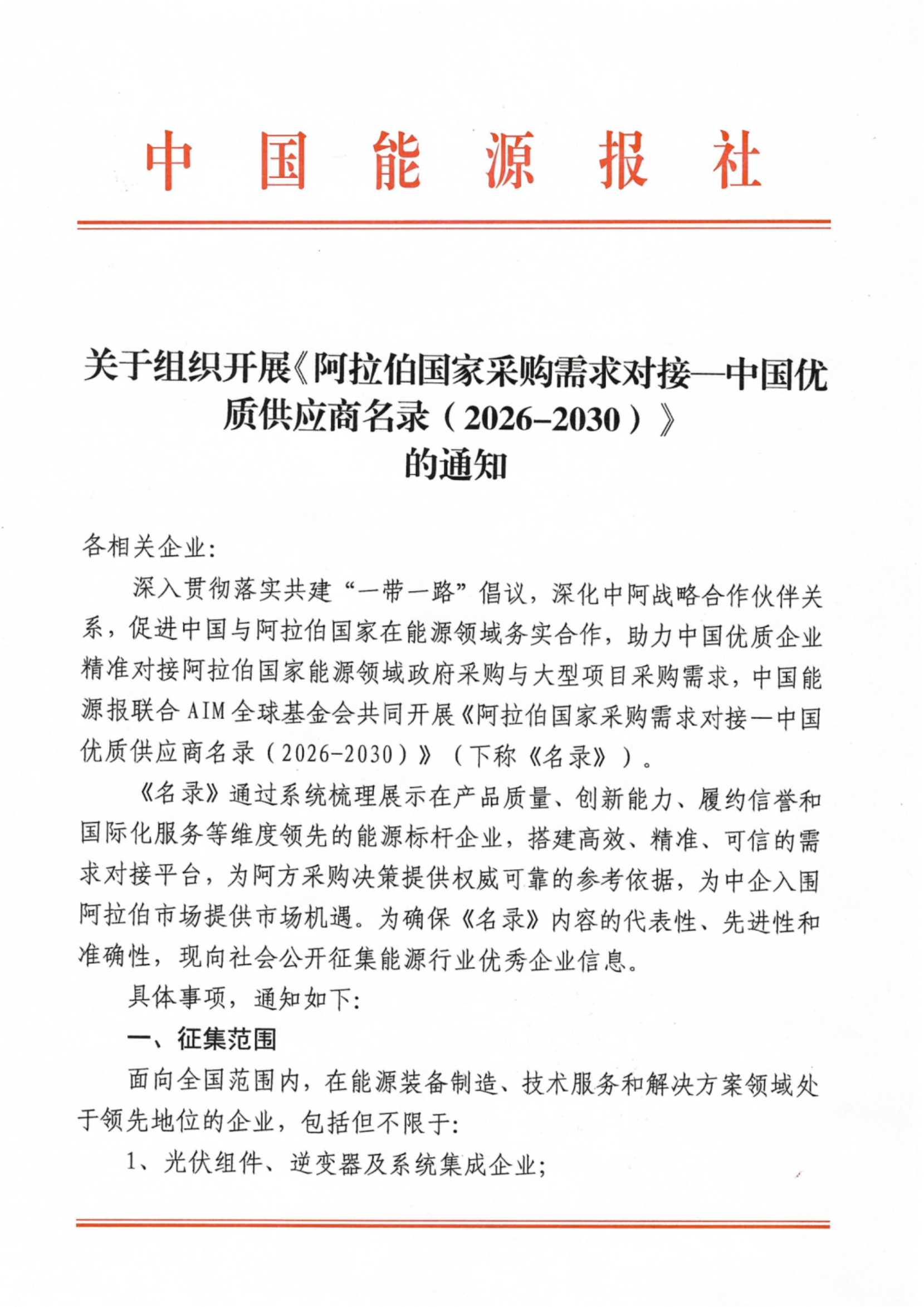 深入贯彻落实共建“一带一路”倡议,深化中阿战略合作伙伴关系,促进中国与阿拉伯国家在能源领域务实合作,助力中国优质企业精准对接阿拉伯国家能源领域政府采购与大型项目采购需求,中国能源报联合AIM全球基金会共同开展《阿拉伯国家采购需求对接—中国优质供应商名录(2026-2030)》(下称《名录》)。
