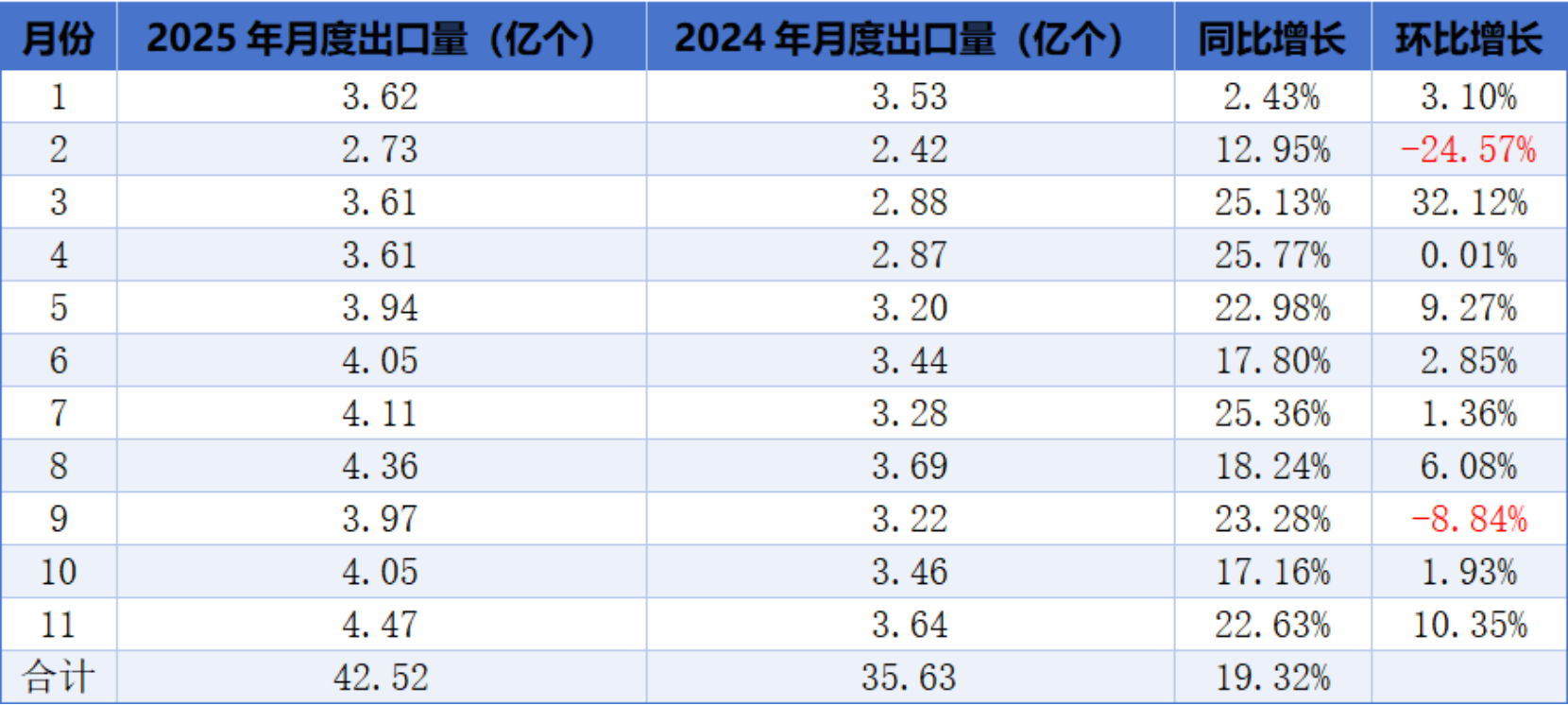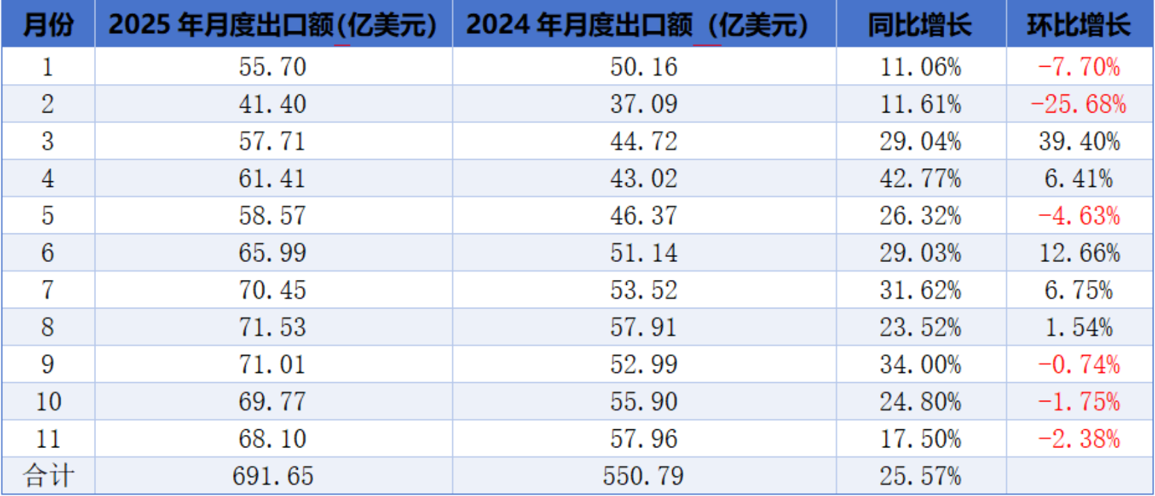 表一2025年1-11月锂离子电池出口量月度变化情况