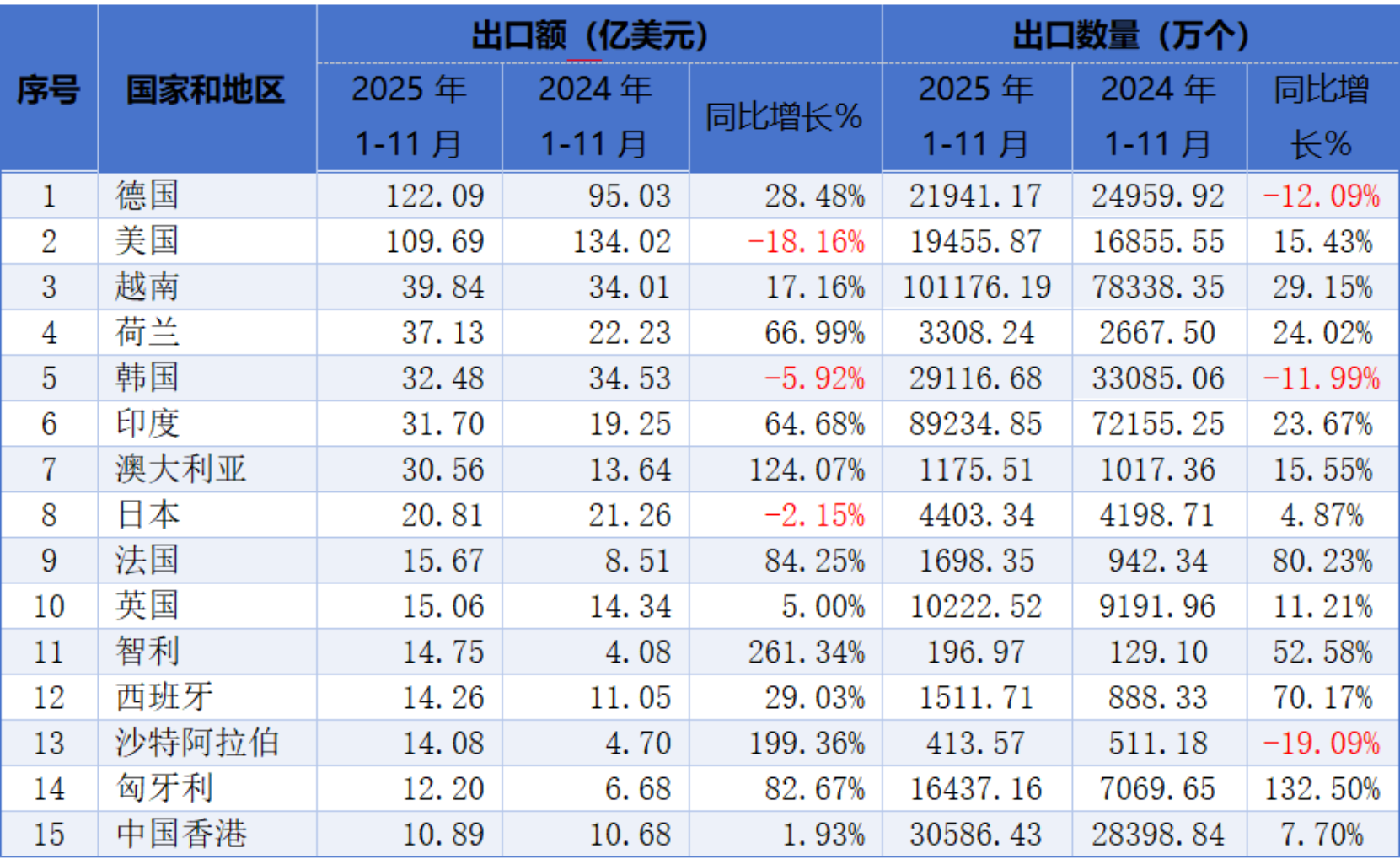 表三2025年1-11月锂离子电池出口额前15大目的地变化情况