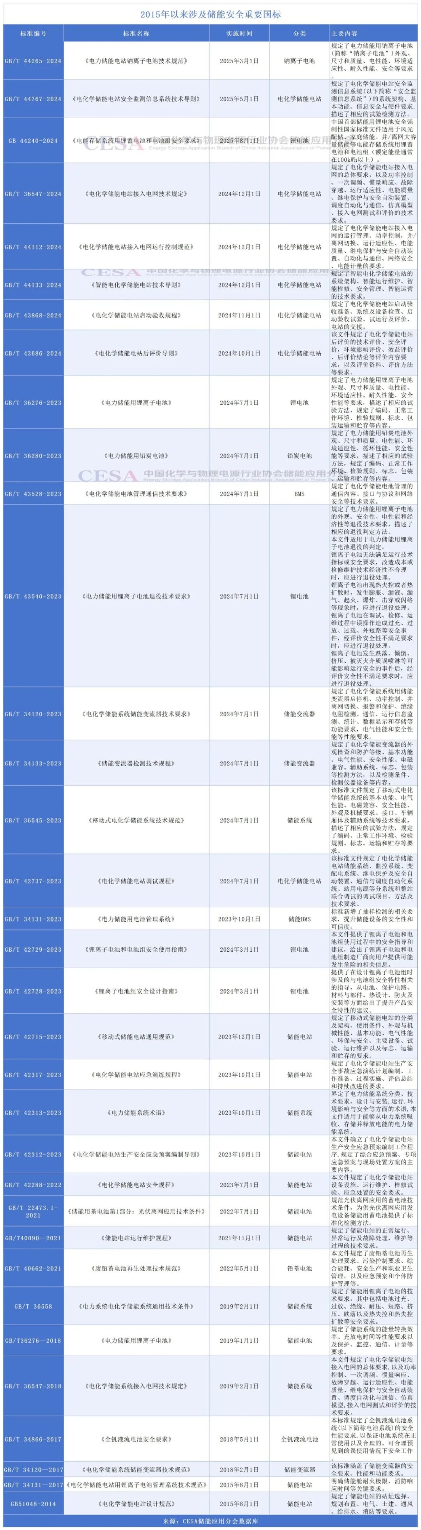 据CESA储能应用分会不完全统计,2015年以来的十年间,中国实施了30多项涉及储能安全的重要国家标准,这些国标不仅涉及了储能锂电池、储能系统、储能变流器、储能BMS、钠离子电池、全钒液流电池、铅碳电池等多个技术类型,还形成覆盖储能电站规划设计、设备及试验、施工及验收、并网及检测、运行与维护、评价等方面的储能标准体系。