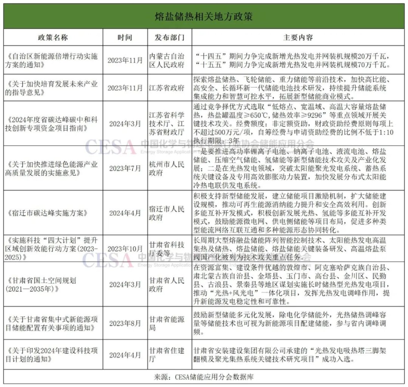 地方层面,江苏、甘肃、内蒙古、北京、山西、山东等地方政府纷纷出台政策支持熔盐储热及其主要应用领域光热发电产业发展。