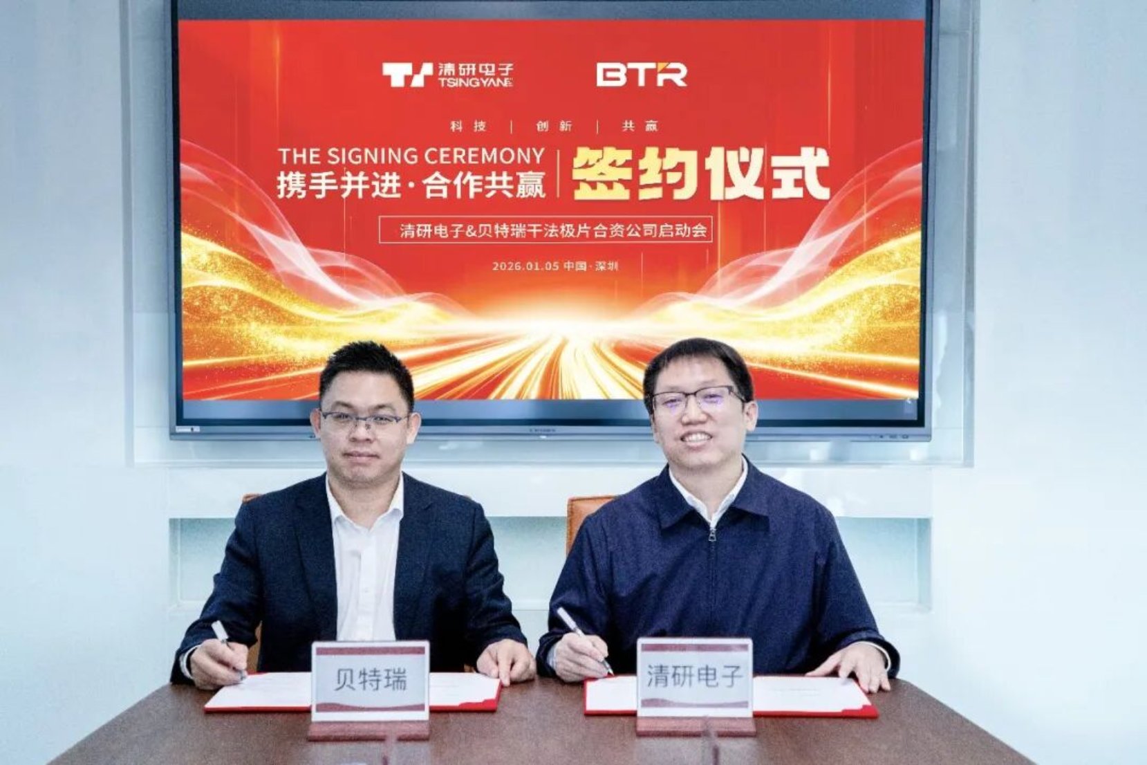 1月5日,协会会长单位贝特瑞与协会理事单位深圳清研电子签署合资公司合作协议,双方将就推动干法电极产业化工作展开深入合作,共同推动锂电前沿关键工艺革新。贝特瑞正极事业部总经理杨顺毅博士、深圳清研电子总经理王臣博士等出席签约仪式。