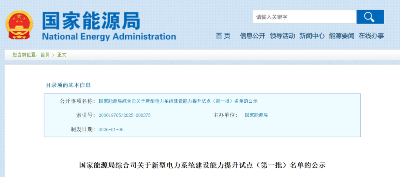 国家能源局综合司关于新型电力系统建设能力提升试点(第一批)名单的公示