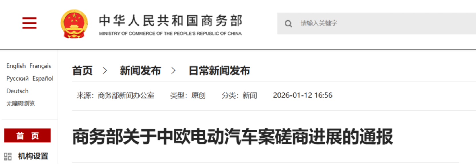 1月12日,商务部网站发布《关于中欧电动汽车案磋商进展的通报》。