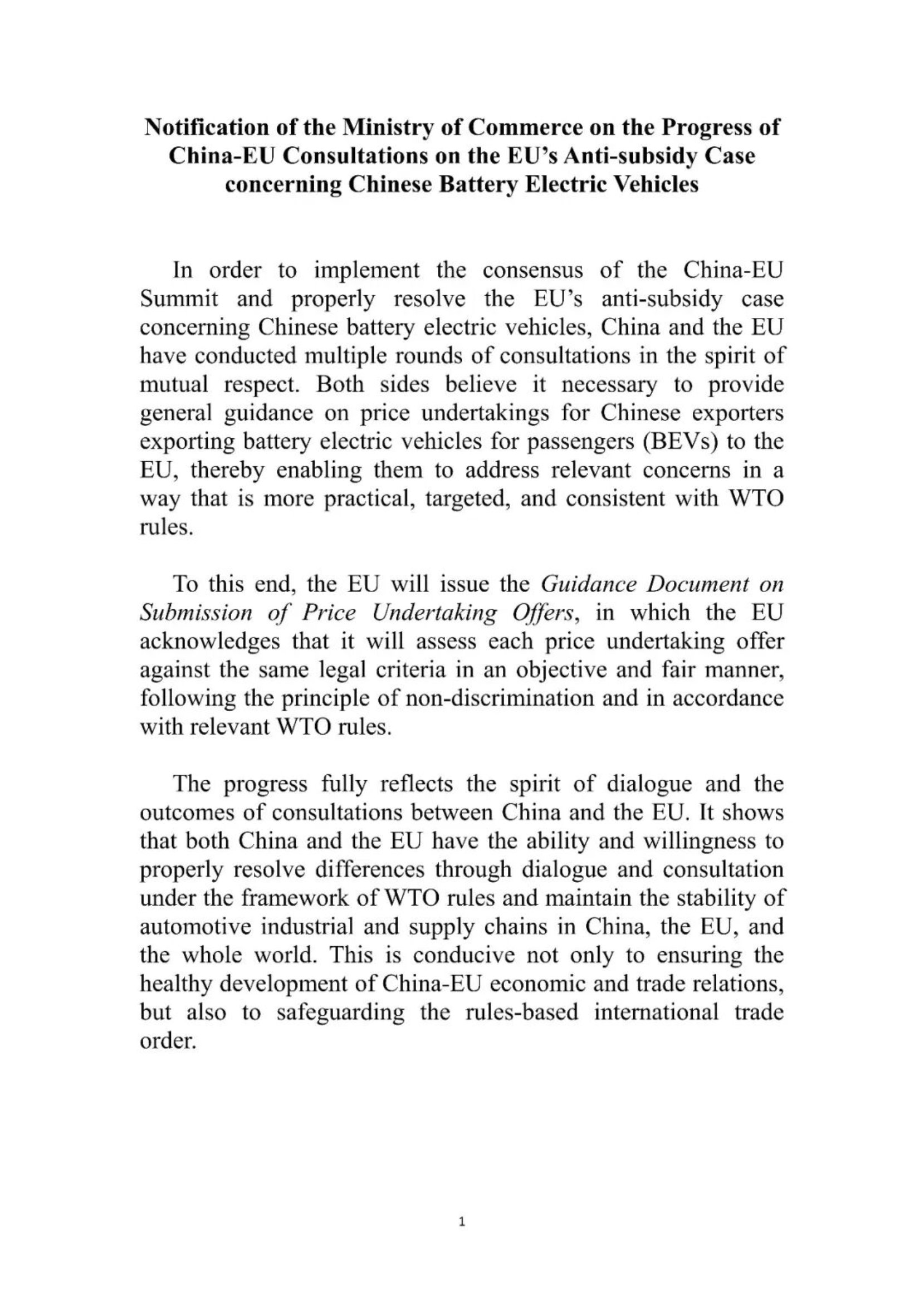 为落实中欧领导人会晤共识,妥善解决欧盟对华电动汽车案,中欧双方本着相互尊重的态度,进行了多轮磋商。双方一致认为,有必要向对欧盟出口纯电动汽车的中国出口商,提供关于价格承诺的通用指导,以便中国出口商可通过更加实用、有针对性且符合世贸组织规则的方式,解决相关关注。