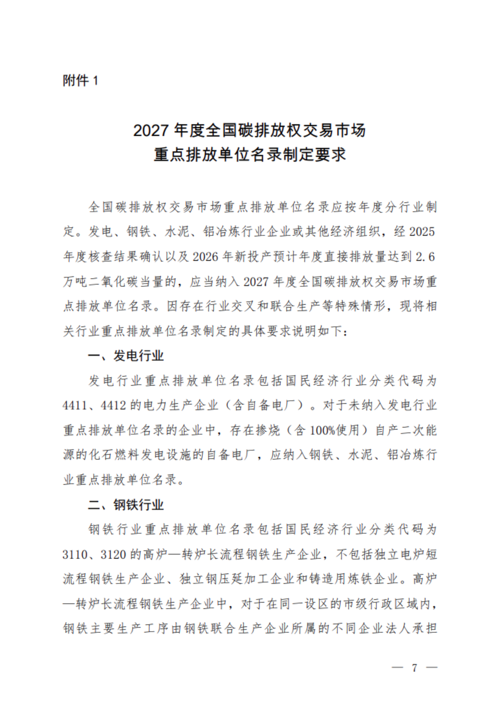 省级生态环境主管部门要制定本行政区域2027年度重点排放单位名录,将发电、钢铁、水泥、铝冶炼行业年度直接排放量达到2.6万吨二氧化碳当量的单位纳入全国碳排放权交易市场管理,名录制定的具体条件见附件1。