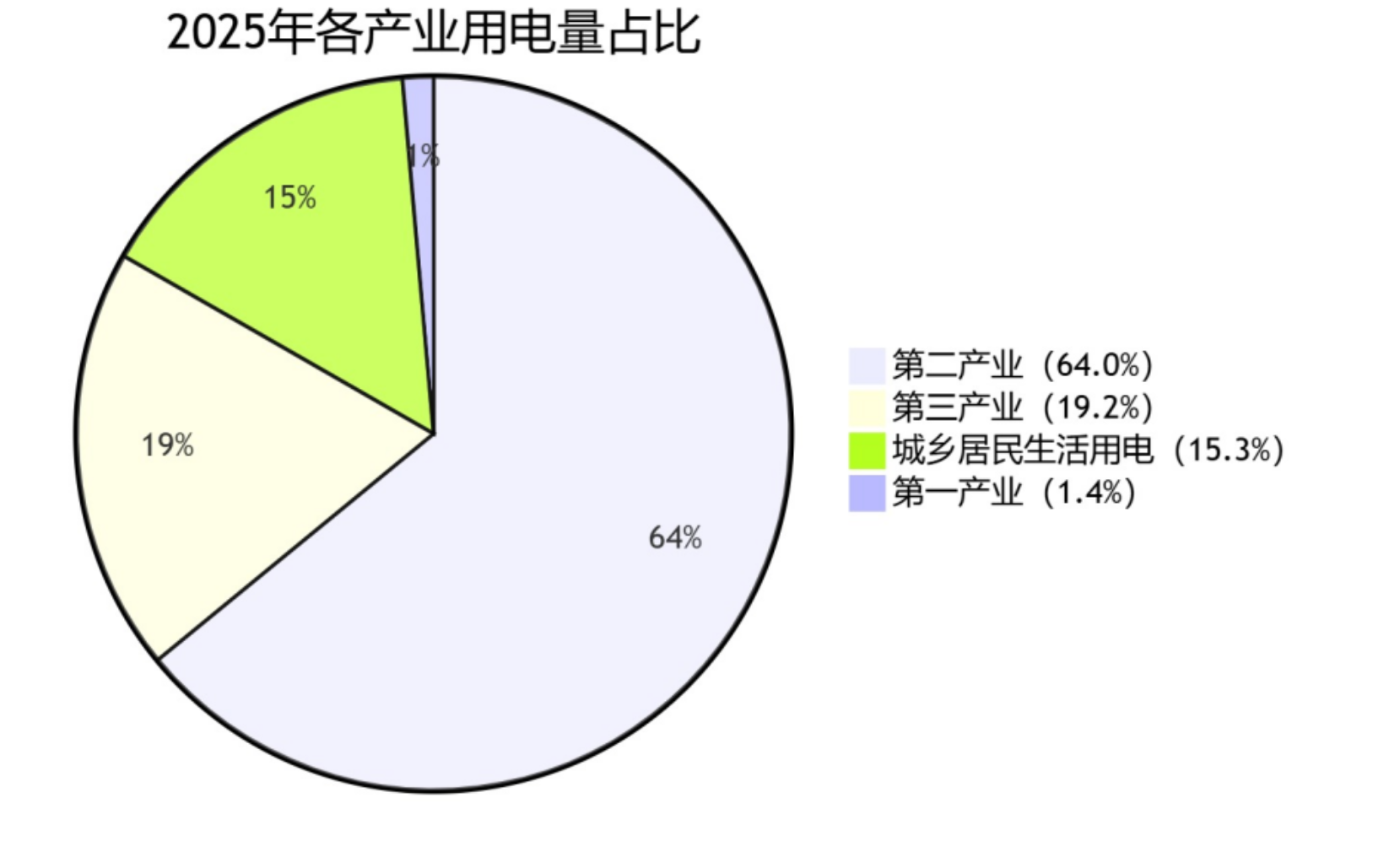 2025年,我国全社会用电量结构呈现出鲜明的产业特征与转型趋势。从整体占比看,第二产业仍占据绝对主导地位,用电量占比达64.0%,是支撑国民经济运行的核心动力源。第三产业与城乡居民生活用电分别占比19.2%和15.3%,第一产业用电占比为1.4%,整体结构延续了“工业为主、服务与消费协同”的发展格局。