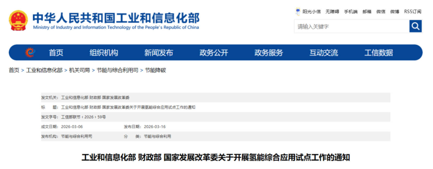 工业和信息化部 财政部 国家发展改革委关于开展氢能综合应用试点工作的通知