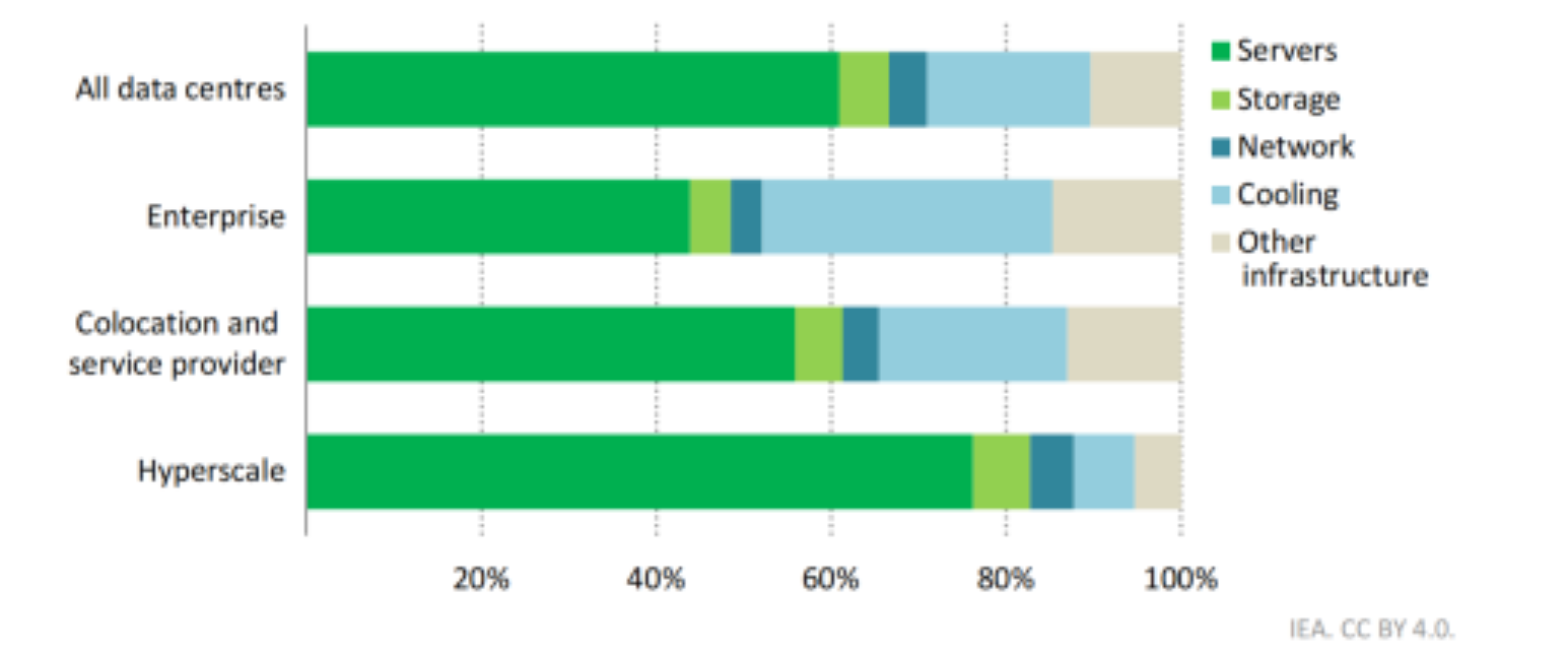 从数据中心能耗构成来看,服务器占比最高,可达60%,其余能耗主要来自冷却系统等环节。其中,服务于IT设备的冷却系统、供电设备等基础设施的能耗,成为推高PUE值的关键因素。