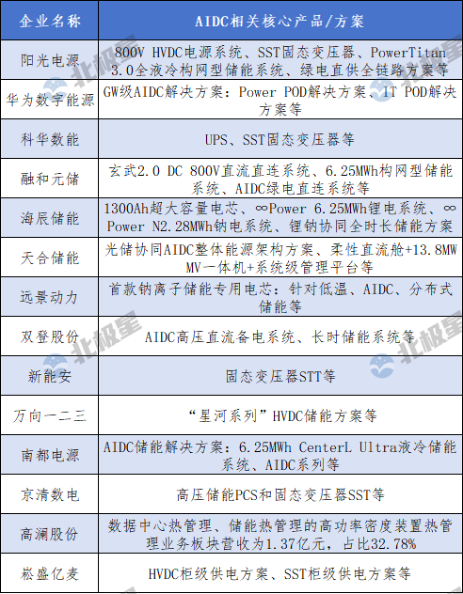 而本就属于储能领域各环节的企业也纷纷瞄准数据中心这条赛道,布局AIDC相关业务。据北极星储能网不完全统计,目前已有阳光电源、华为数字能源、科华数能、融和元储、海辰储能、天合储能、远景动力、双登股份、新能安、万向一二三、南都电源、京清数电、高澜股份、崧盛亿麦企业披露相关信息。