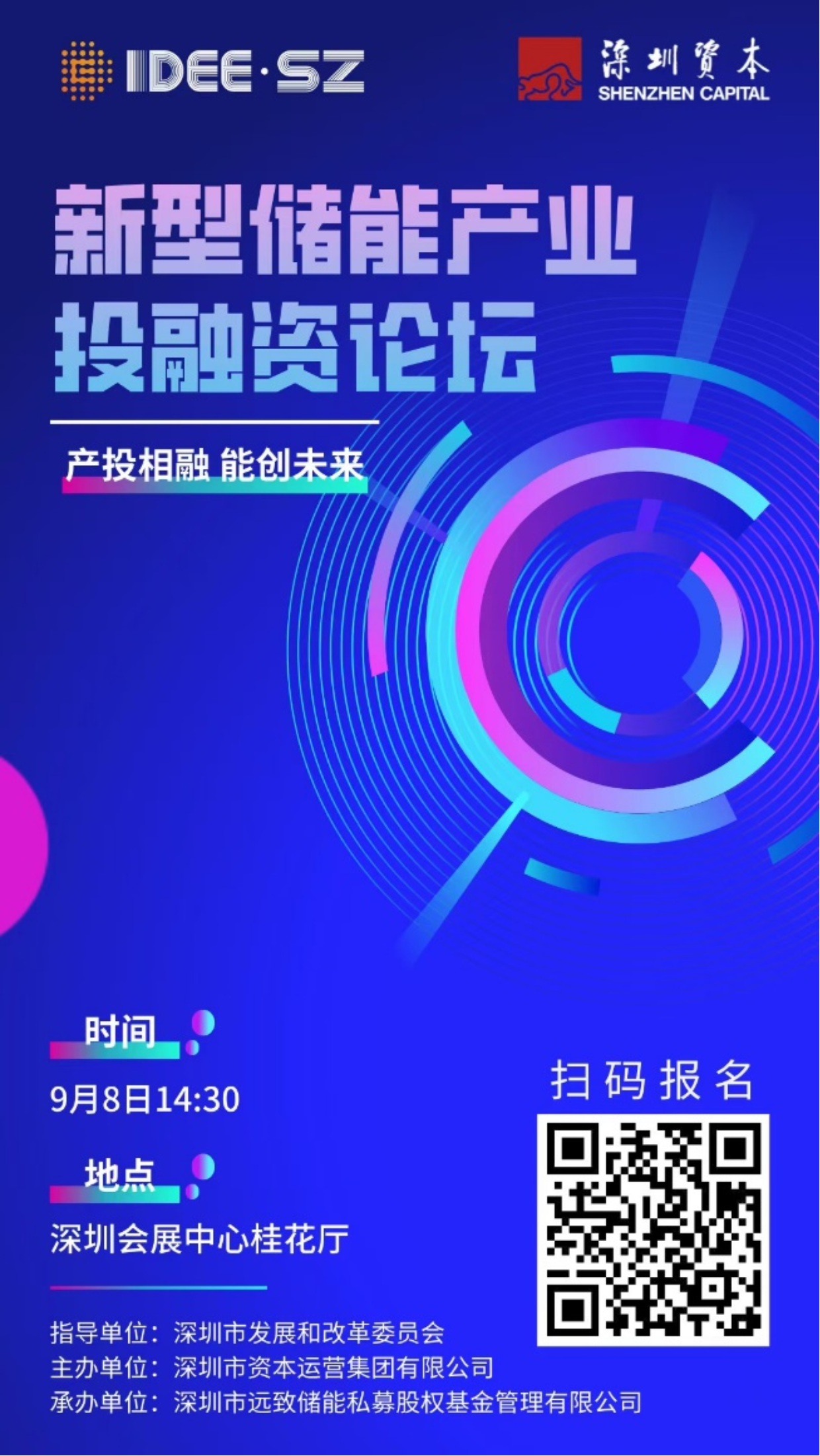 在深圳市发展和改革委员会的指导下,由深圳市资本运营集团有限公司主办,深圳市远致储能私募股权基金管理有限公司承办的新型储能产业投融资论坛,将作为本届展会8场平行论坛之一,于9月8日14:30在深圳会展中心桂花厅举行,论坛以“产投相融 能创未来”为主题,设置领导致辞、深圳市新型储能产业基金集中签约、主题演讲和圆桌对话四个环节,邀请政策研究部门、产业界和学术界资深院士、专家、企业家,围绕新型储能产业面临的机遇与问题展开讨论,并展现深圳市新型储能产业基金组建一年来,在子基金设立、产业研究及项目储备方面所取得的成果。